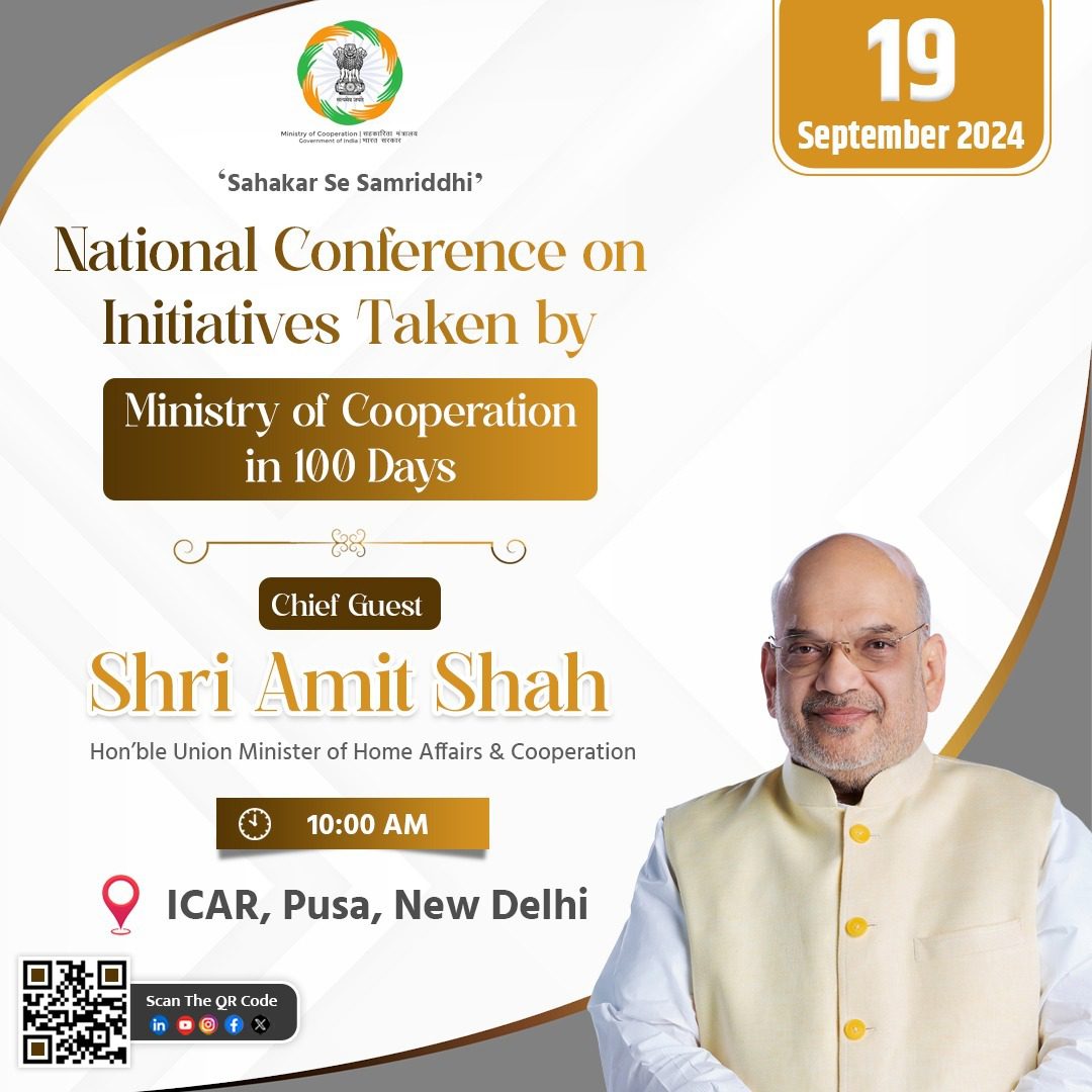 Ministry of Cooperation, Government of India is organizing a day-long National Conference on ‘Initiatives Taken by the Ministry of Cooperation in 100 Days’ on 19 September in New Delhi. The event will focus on the initiatives undertaken by the Ministry of Cooperation and the roadmap ahead.